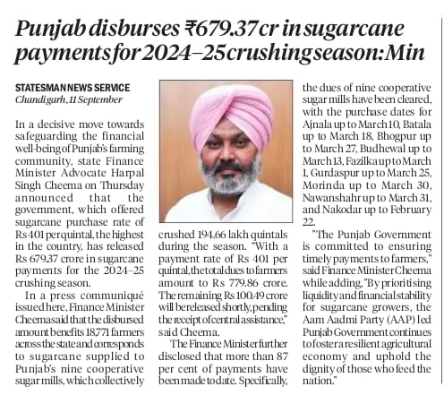 https://x.com/harjotbains/status/1965823678840725694Punjab disburses ₹679.37 crore in sugarcane payments for 2024-25 crushing season: Harpal Singh Cheema