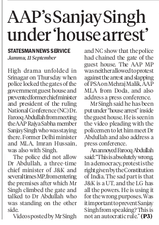 https://x.com/anuragdhanda/status/1966039930032795722A former Chief Minister cannot meet an MP.AAP MP @SanjayAzadSln ji arrived in Jammu and Kashmir to register a protest against the undemocratic arrest of AAP MLA @MehrajMalikAAP ji, police have placed him under House Arrest, to the extent that even the current Chief Minister's father and former Chief Minister Farooq Abdullah ji is not being allowed to meet him. If this is not dictatorship, then what is it?