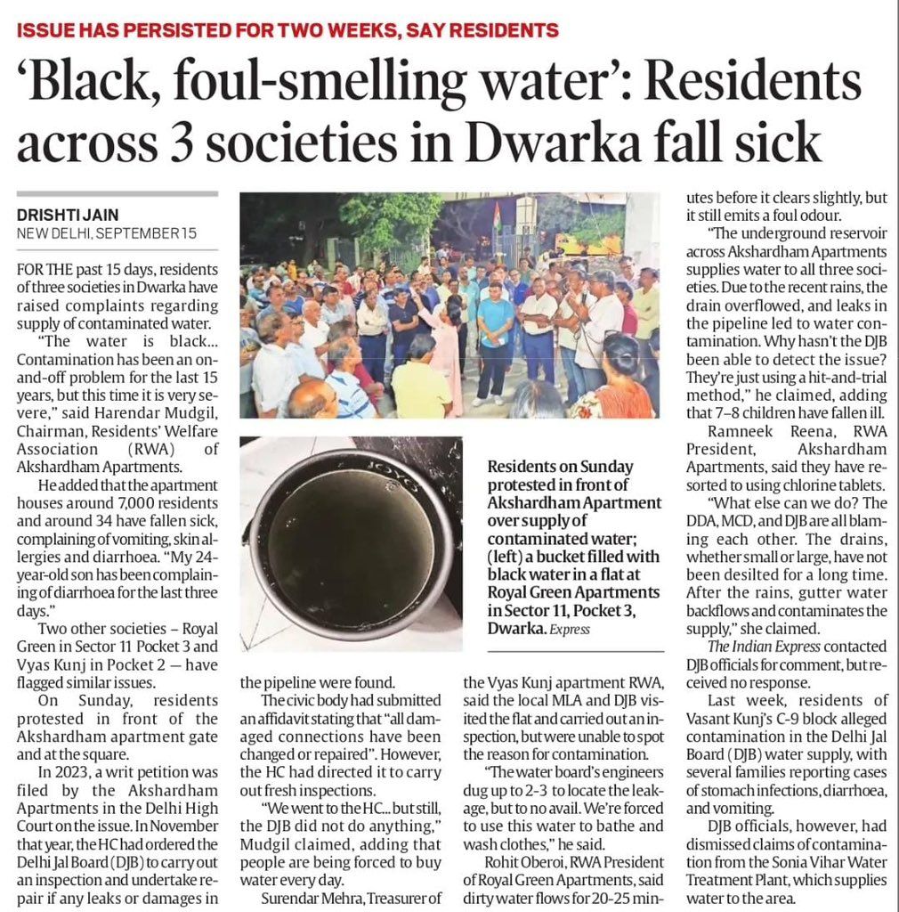 https://x.com/NewsAAPKe/status/1967864827503948138Delhi’s Middle class & Dwarka residents, Ask yourself, why ur English Newspaper did NOT cover this news ? Why ? It’s very rare that Delhi’s Middle class staying in Dwarka Apartment is out on roads protesting against Delhi Govt for contaminated water. Must thank indianExpress for giving ample space to ur voice.