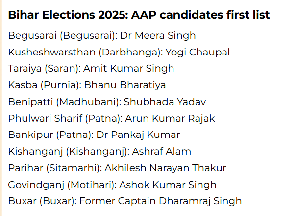 id=21178711212 12AAP BIHAR : Bihar Elections 2025: Aam Aadmi Party announces first list of 11 candidates for state polls https://financialexpress.com/india-news/bih