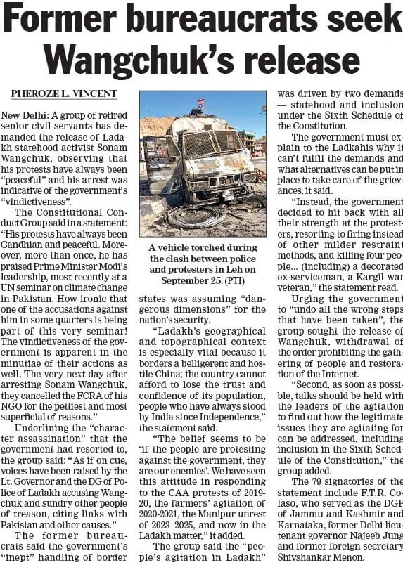 https://www.financialexpress.com/india-news/arrest-anjana-om-kashyap-fir-against-aaj-tak-anchor-india-today-group-chairman-aroon-purie-what-is-the-case/4009227/Former bureaucrats seek Wangchuk's release.