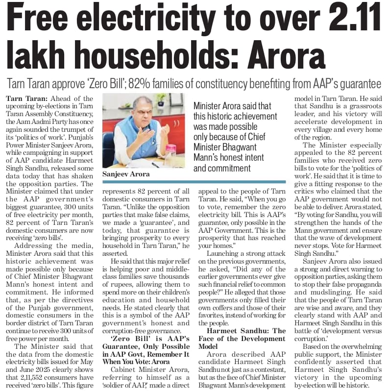 https://navbharattimes.indiatimes.com/state/punjab-and-haryana/chandigarh/punjab-sees-90-percent-reduction-in-stubble-burning-incidents-bhagwant-mann-govt-plan-providing-effective/articleshow/124750497.cmsTarn Taran approve Zero Bill; 82% families of the constituency benefitting from free electricity.