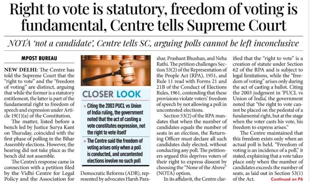 "NOTA" is not a candidate: Centre tells the Supreme Court, arguing that polls cannot be left inconclusive.