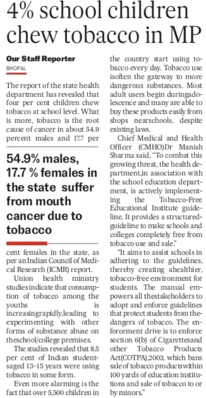 4% of school children chew tobacco at school level. 54.9% males and 17.7% females in Madhya Pradesh suffer from mouth cancer due to tobacco.