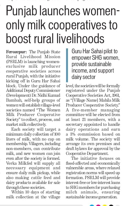The Punjab State Rural Livlihood Mission is launching women-exclusive milk producer cooperative societies across rural Punjab to boost rural livelihoods.