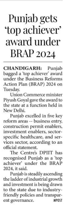 https://x.com/AamAadmiParty/status/1988539767441739899?s=20Punjab bagged 'top achiever' award under the Business Reforms Action Plan 2024.