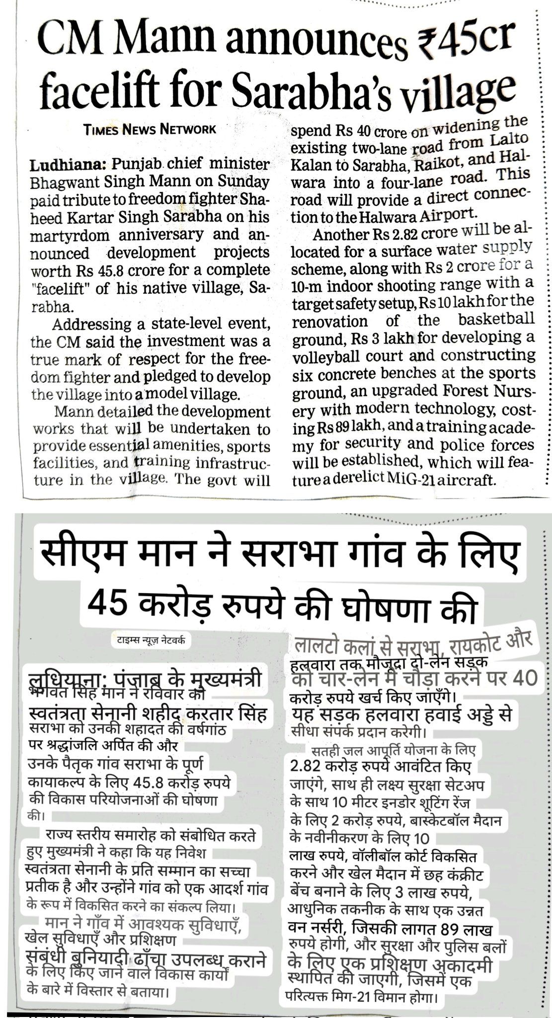 15. Announced Development project of Rs 45 crore Facelift for Sarabha's Villages.
