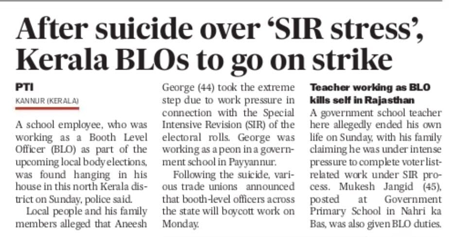 After suicide [ of a Teacher] BLOs over 'SIR stress', Kerala BLOs, to go on strike.