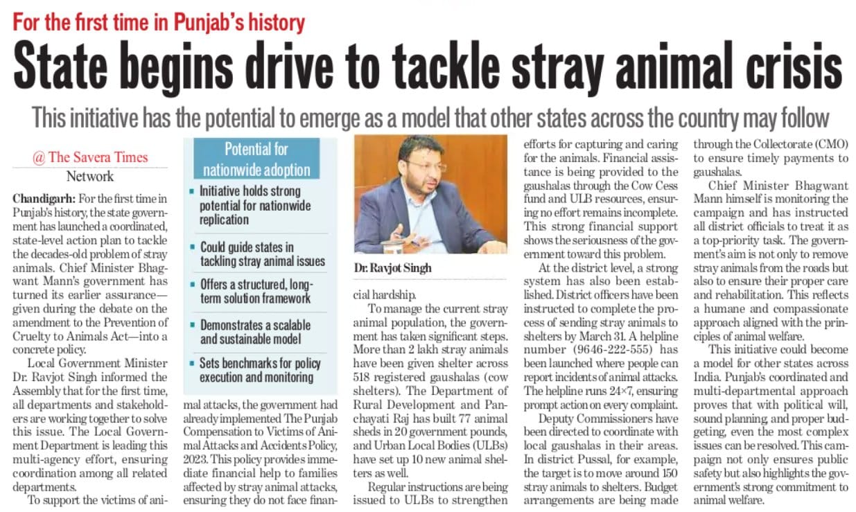 For the first time in Punjab's history State begins drive to tackle stray animal crisis The initiative has the potential to emerge as a model that other states across the country may follow.