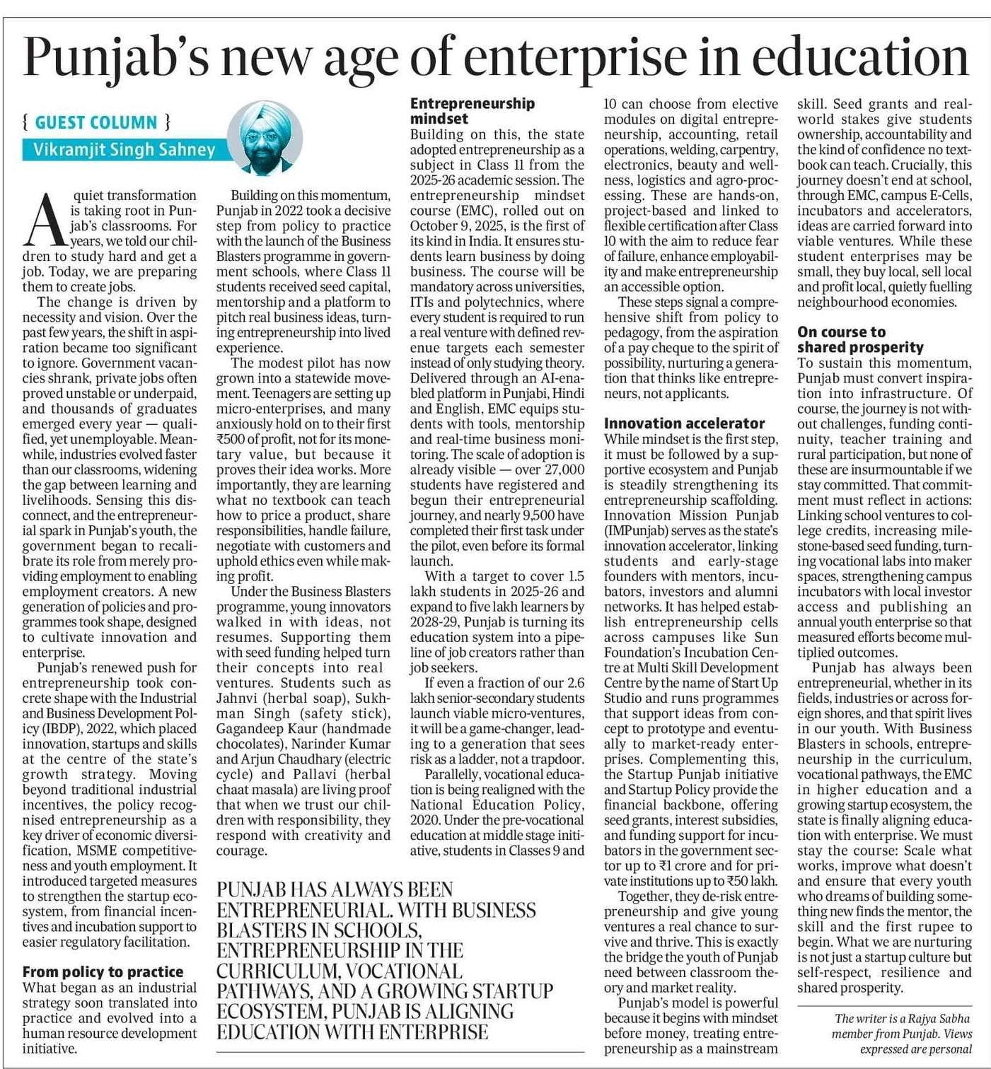The biggest change in Punjab's education revolution is this: now every child studying in schools and colleges is not just being prepared to seek a job, but rather to think of their own business idea and work on it. And this is not choice-based but entirely compulsory. For the first time in the entire country, this is happening here, from where the future's big job creators will emerge. Do read this article by Mr. @vikramsahney in Hindustan Times.