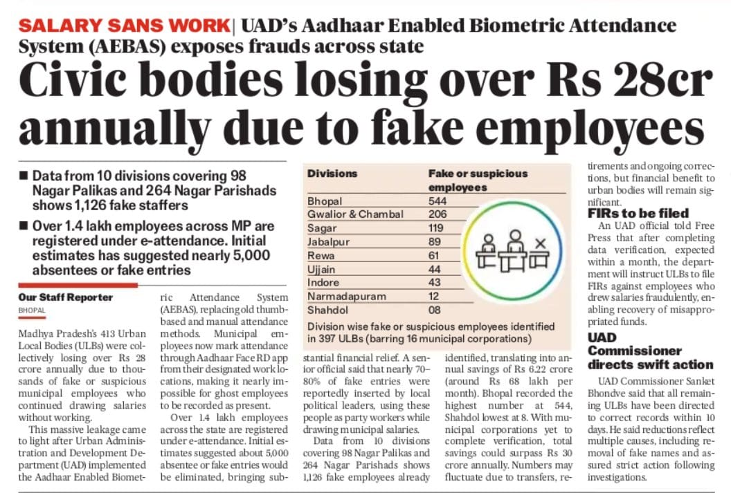Salary sans work: Aadhar-enabled biometric attendance exposes fraud across Madhya Pradesh Civic bodies lose over ₹28 crore annually due to fake employees.