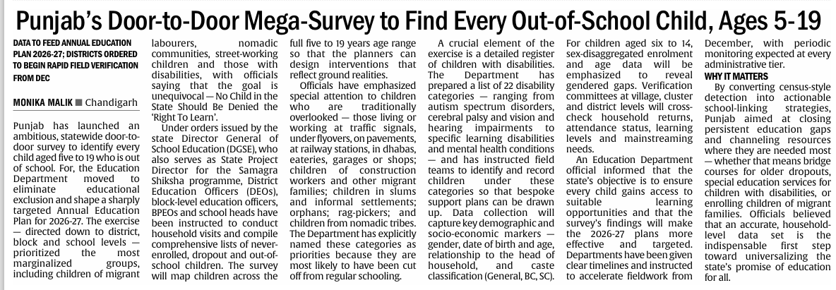 https://x.com/AamAadmiParty/status/1991421253304086852?s=20Punjab has launched an ambitious, state-wide door-to-door survey to identify every child aged five to 19 who is out of school, aiming to eliminate educational exclusion and shape a sharply targeted annual education plan for 2026-27
