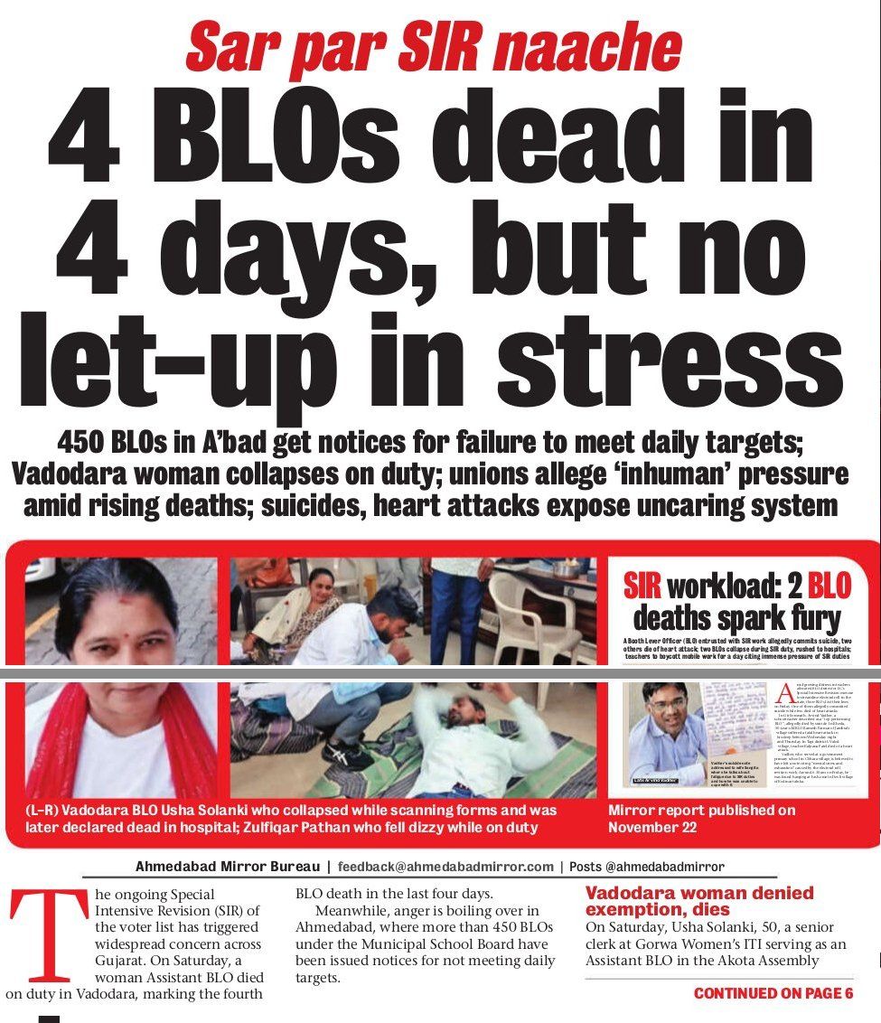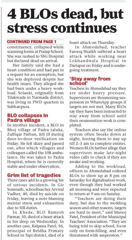Sar par SIR naache 4 BLOs dead in 4 days, but no let-up in stress 450 BLOs in Ahmedabad get notices for failure to meet daily targets...