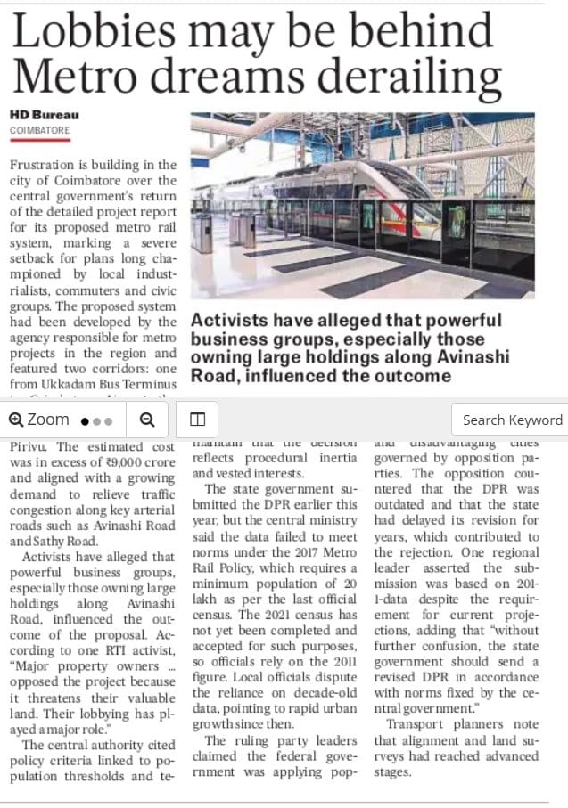 Powerful lobbies in Coimbatore, especially those with large land holdings along Avinashi Road, are suspected of derailing the metro proposal. Or, the political resistence of the Central Government?
