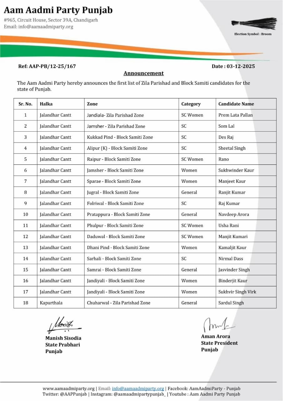 The Aam Aadmi Party announces the first list of candidates for the Punjab Zila Parishad and Block Samiti. AAP names 961 candidates for Punjab local body polls