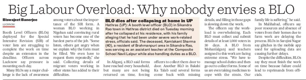 Big labour overload: Why nobody envies a BLO? BLO dies after collapsing at home in UP.