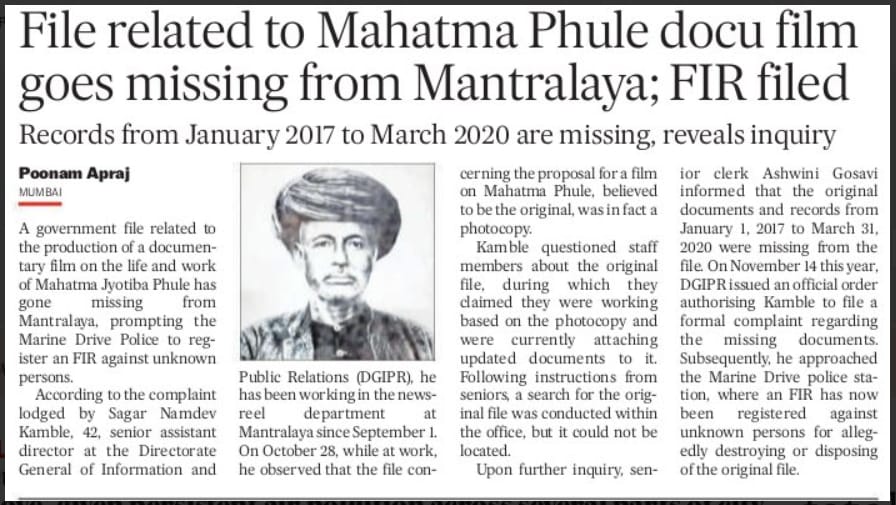 Mumbai: File related to Mahatma Phule docu film goes missing from Mantralaya.