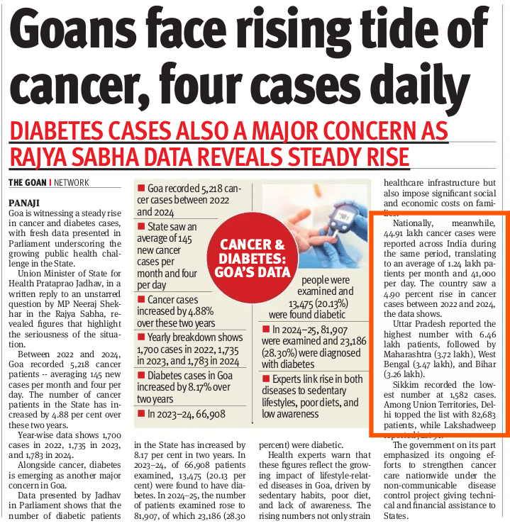 Goans face rising tide of cancer - four cases daily Nationally 44.91 lakh cancer cases were reported for 2024-25 - 124 lakh patients per month (41,000 per day). UP leads with 6.46 lakh patients.
