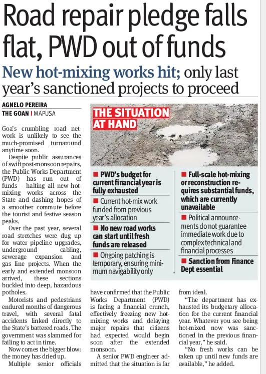 GOA : Goa: Road repair pledge falls flat - PWD is out of funds.