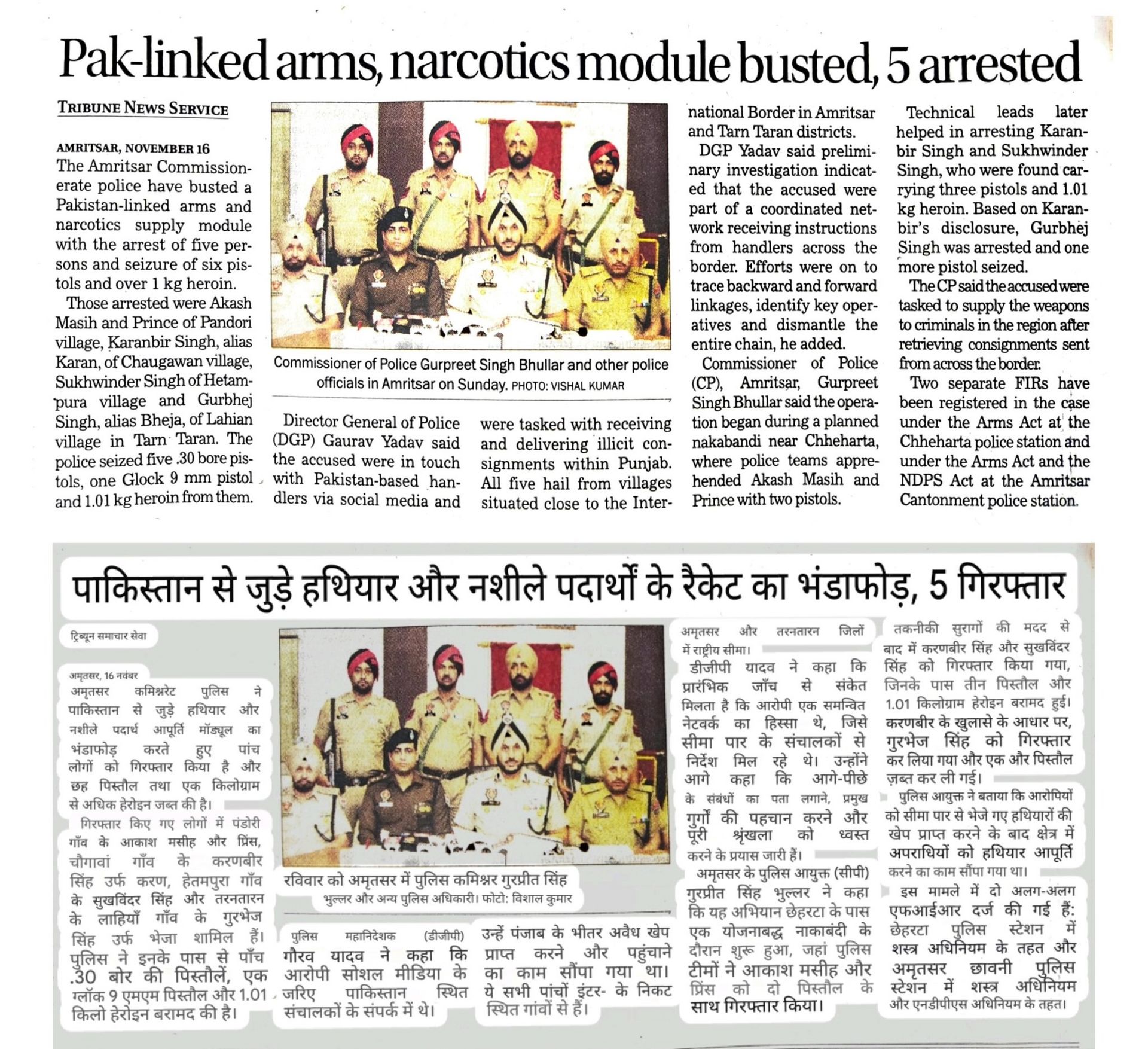 Pak-linked arms, narcotics, grenades busted & 15 Key operatives of foreign handlers arrested.