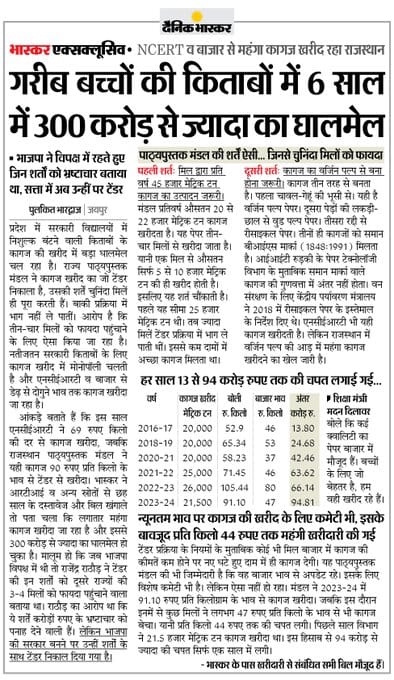 राजस्थान : सरकारी विद्यालयों में निशुल्क बंटने वाली किताबों के कागज की खरीद में बड़ा घालमेल... NCERT व बाजार से महंगा कागज खरीद रहे, 6 साल में ₹300 करोड़ किए खर्च