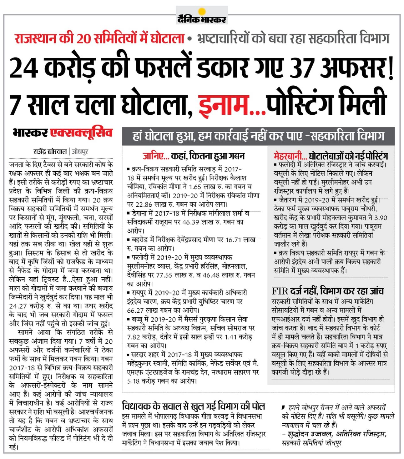 https://divyamarathi.bhaskar.com/dvm-originals/news/rajasthan-blood-bank-scam-part-two-dengue-malaria-platelets-price-black-marketing-134059204.htmlराजस्थान की 20 समितियों में घोटाला : 37 अफसरों ने 24 करोड़ की फसलें डकारी... भ्रष्टाचारियों को बचाने में लगा सहकारिता विभाग