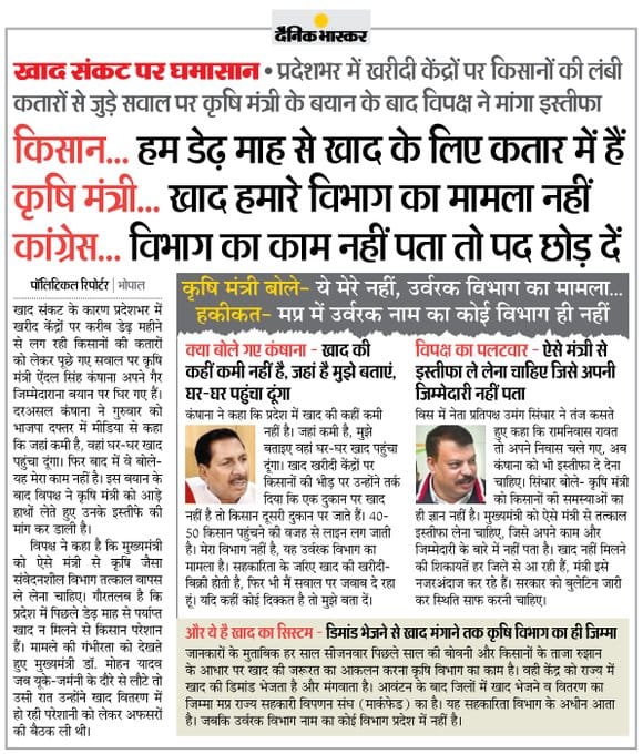मध्यप्रदेश में छाया खाद संकट: खरीदी केंद्रों पर किसानों की लंबी कतारें लगी... विपक्ष ने कृषि मंत्री पर उठाए सवाल, मांगा इस्तीफा